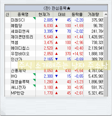 신풍제약부터 MP한강까지의 종목들은 이번주 새롭게 편입시킨 관심종목으로, 주로 차트를 보고 종목을 체크했고, 실적이 좋지 않은 기업들도 더러 포함되어 있을 수 있습니다.
