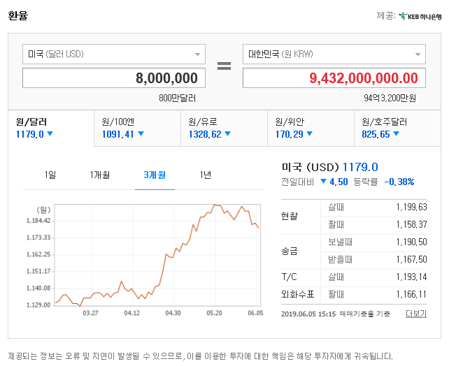 800만달러는 한국돈으로 현재 약 94억 3200만원입니다. 이전 같았으면 90억원이 채 되지 않았을텐데, 요즘 환율이 많이 올라 우리나라돈으로 95억원에 가까운 돈입니다.