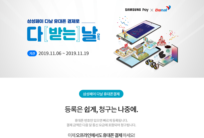 특히 다날은 최근 삼성페이 테마주로 각광받고 있는데, 다날은 삼성페이 휴대폰 결제 오프라인 서비스를 오픈하고 이를 기념해 다양한 프로모션을 진행하고 있습니다.