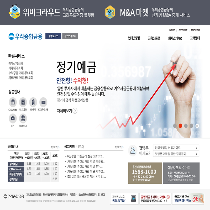 현재 우리금융그룹의 시너지를 기반으로 신규수익원을 지속적으로 개발하고 국내 유일의 종합금융회사로 다양한 라이센스를 충분히 활용하는 성장전략을 모색중인 기업입니다. 주로 하는 일은 수신과 단기 및 중장기 여신, 유가증권 운용, 금융상품 판매, 프로젝트 파이낸스, 국제금융, M&A 업무 등입니다.