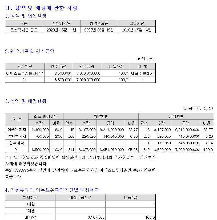 이베스트스팩5호 는 이베스트투자증권을 대표 주관사로 하여 총 350만주를 공모했습니다. 이 중 80% 비중인 280만주를 기관투자자에게, 20% 비중인 70만주를 일반투자자에게 배정했고, 일반투자자 공모청약에서 0.21대 1의 경쟁률로 청약 미달을 보였지만, 미달 물량을 기관투자자의 추가청약분으로 배정되어 실권주는 없었습니다.