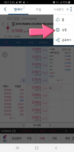우선 스마트폰의 '영웅문S 글로벌' 어플리케이션을 실행 후 '현재가'로 진입해 오른쪽 상단의 점 세개 쪽을 터치후 설정으로 진입합니다.