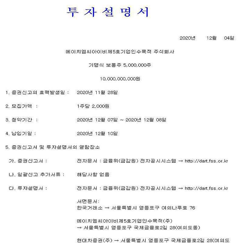 신규상장하는 에이치엠씨제5호스팩은 어떠한 회사이고, 수요예측과 공모주 청약 경쟁률 등을 통해 공모주 상장일 공모가를 넘어설 수 있을지 체크해 보도록 하겠습니다.