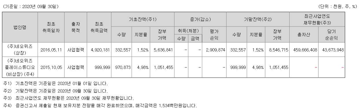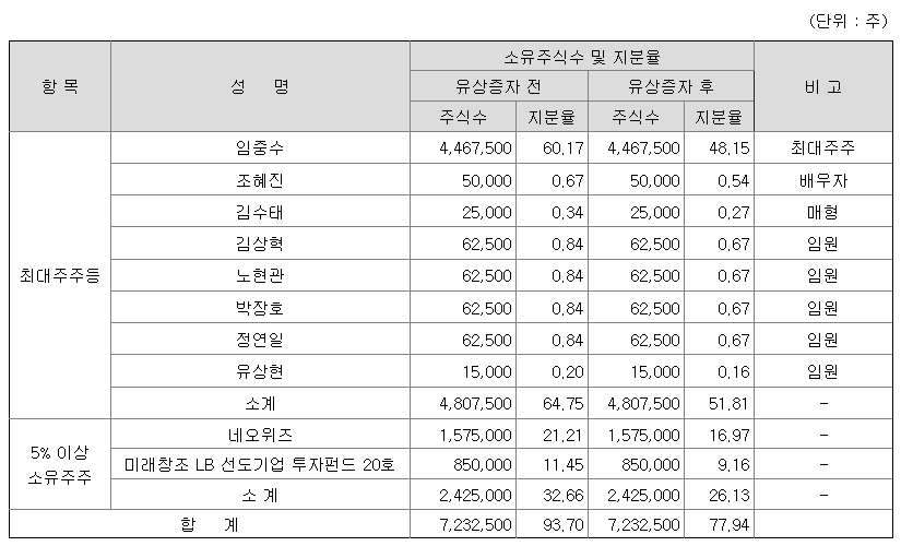 이 외에도 네오위즈가 16.97% 지분을 보유해 2대주주로 올라서있고, 미래창조 LB 선도기업 투자펀드 20호가 9.16%의 지분율을 보유하고 있습니다.