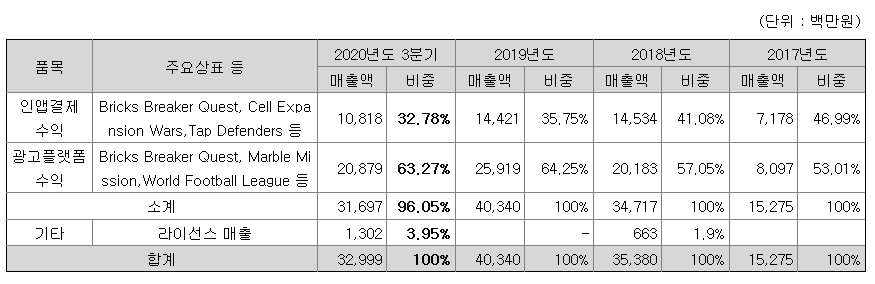 모비릭스의 주요 제품별 매출 현황을 살펴보면 지난해 3분기 기준 Bricks Breaker Quest, Marble Mission, World Foofball League 등 게임안의 광고플랫폼 수익이 전체 매출의 63.27%에 달하고, ricks Breaker Quest, Marble Mission, World Foofball League 등의 인앱결제 수익이 32.78%에 달합니다.