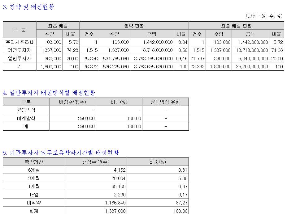 공모주 180만주 중 5.72%인 103,000주를 우리사주조합에, 74.28%인 1,337,000주를 기관투자자에게, 20%인 36만주를 일반투자자에게 최초 배정했고 이대로 최종 배정 및 납입까지 완료되어 상장을 앞두고 있습니다.