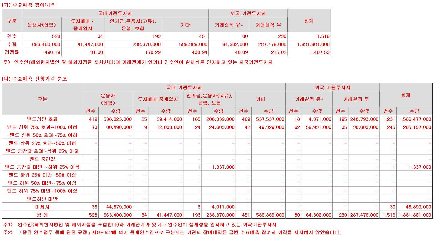 모비릭스는 지난 14일부터 15일까지 1,516곳의 국내외 기관투자자가 참여한 수요예측에서 1,407.53대 1의 높은 수요예측 경쟁률을 기록했습니다.