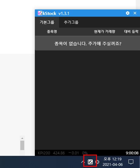 케이 스톡을 실행하면 화면이 뜨지 않을 수도 있는데, 작업표시줄에 아이콘을 선택하면 KSTOCK 프로그램이 나타납니다. 종목 추가를 해보도록 할게요.