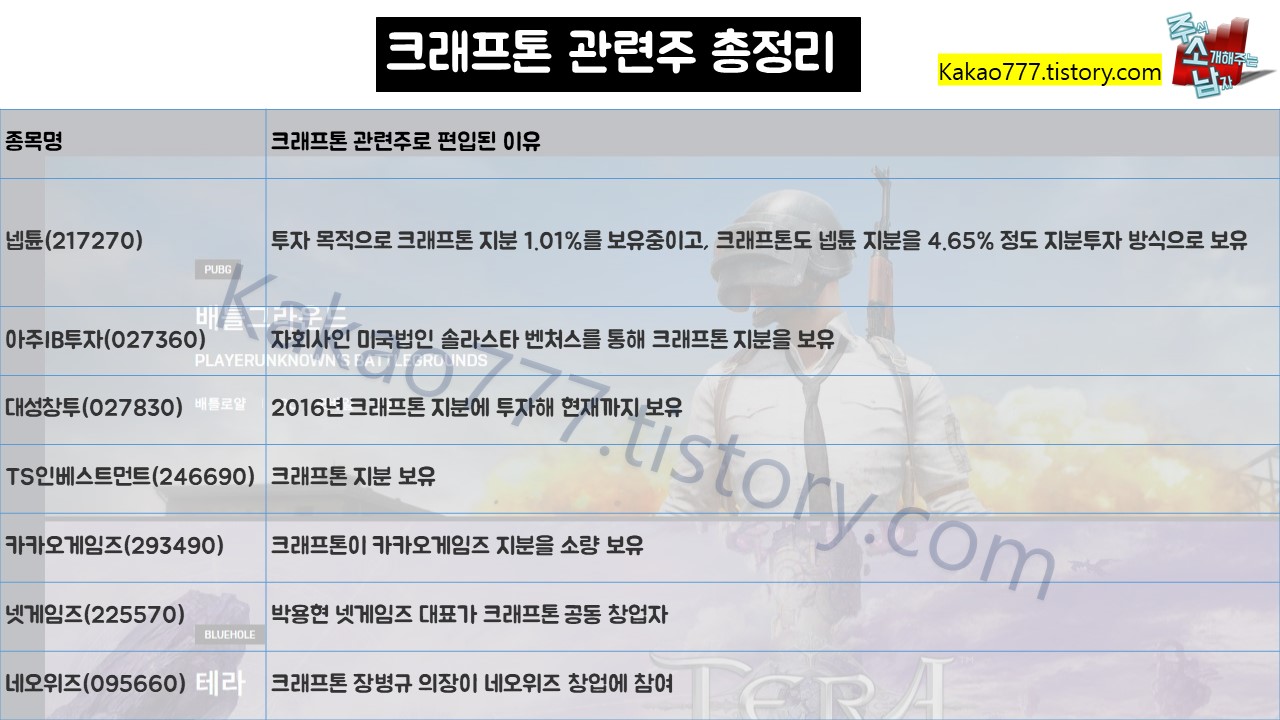 | 종목명 | 크래프톤 관련주로 편입된 이유 |