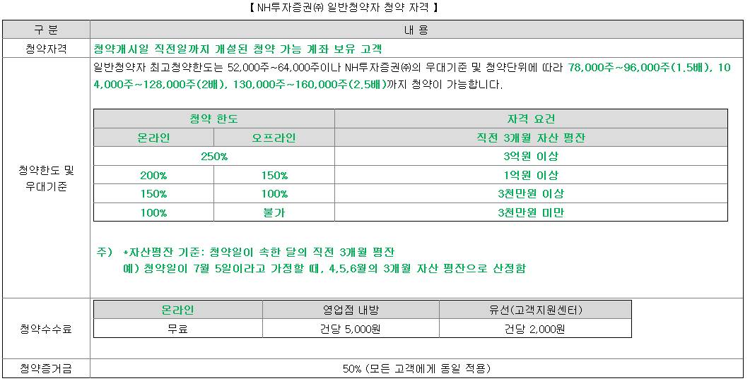 온라인 청약수수료는 무료이지만 영업점 내방시 건당 5,000원, 고객지원센터 유선 연락시 건당 2,000원의 청약 수수료가 있고, 청약 증거금은 모든 고객에게 50%로 동일합니다.
