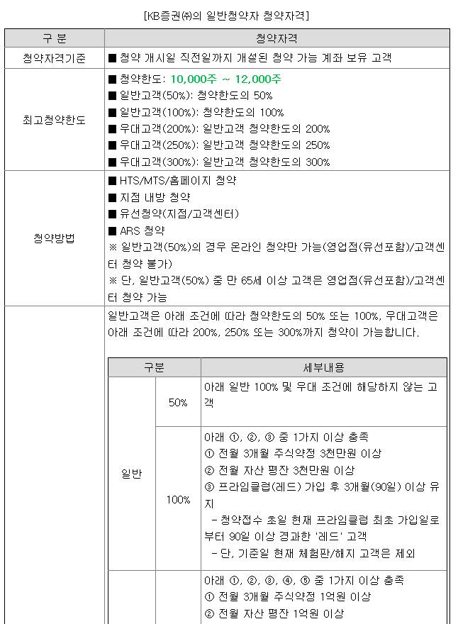 청약 개시일 직전일까지 kb증권 계좌를 봉유한 고객에게 청약 자격이 주어지며 청약한도는 고객 등급별 제한이 있습니다.