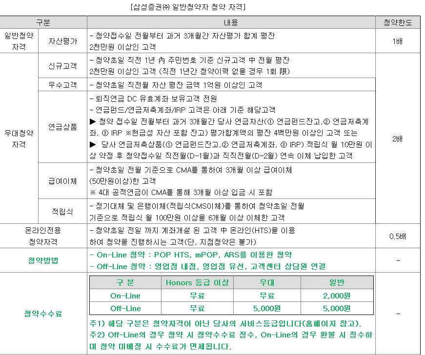 청약초일 전일까지 계좌개설된 고객 중 온라인(HTS)을 이용하여 청약하는 고객은 온라인 전용 청약 자격이 주어지며, POP HTS와 mPOP, ARS를 이용한 온라인 청약이 가능하고, 영업점 내방과 영업점 유선, 고객센터 상담원 연결 등의 오프라인 청약 역시 가능합니다.