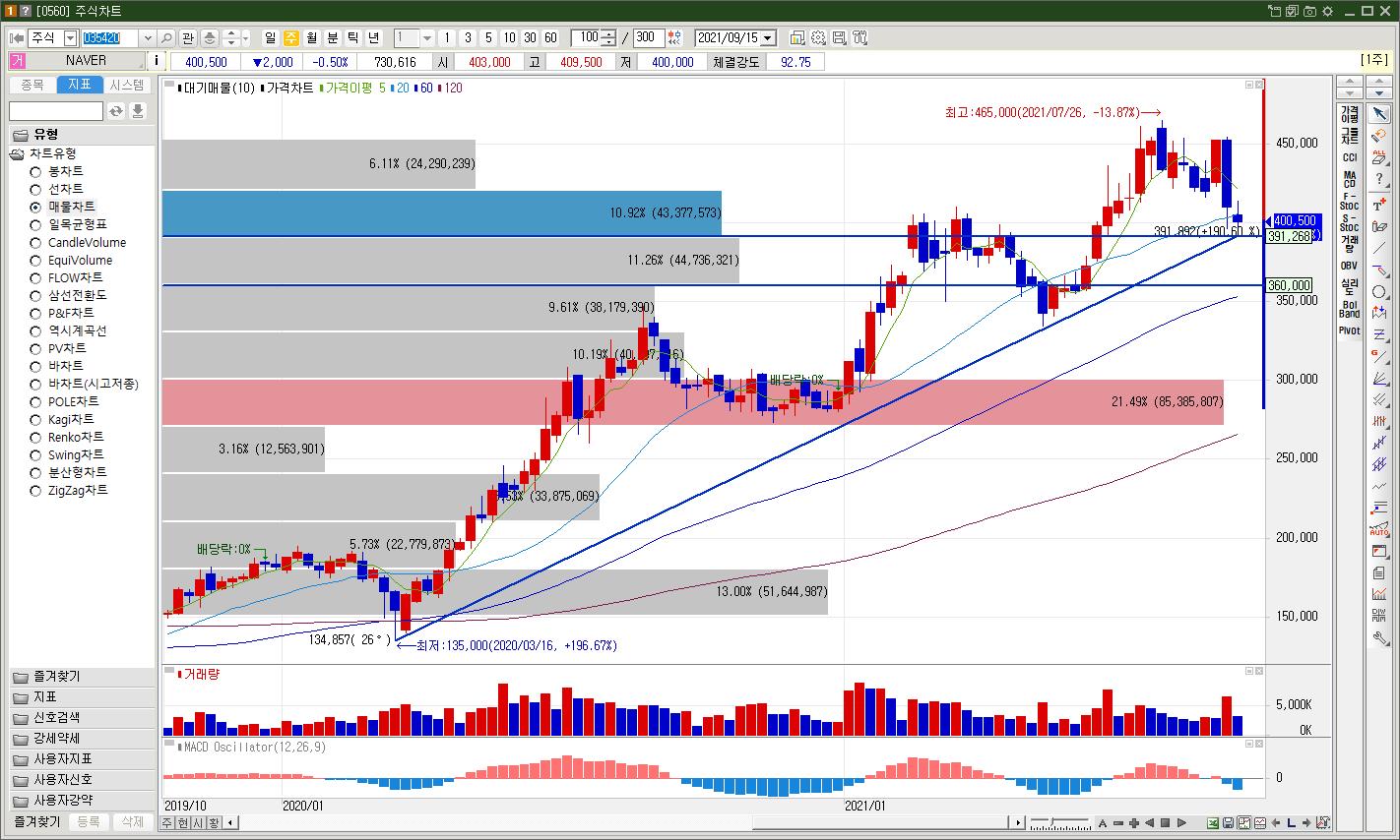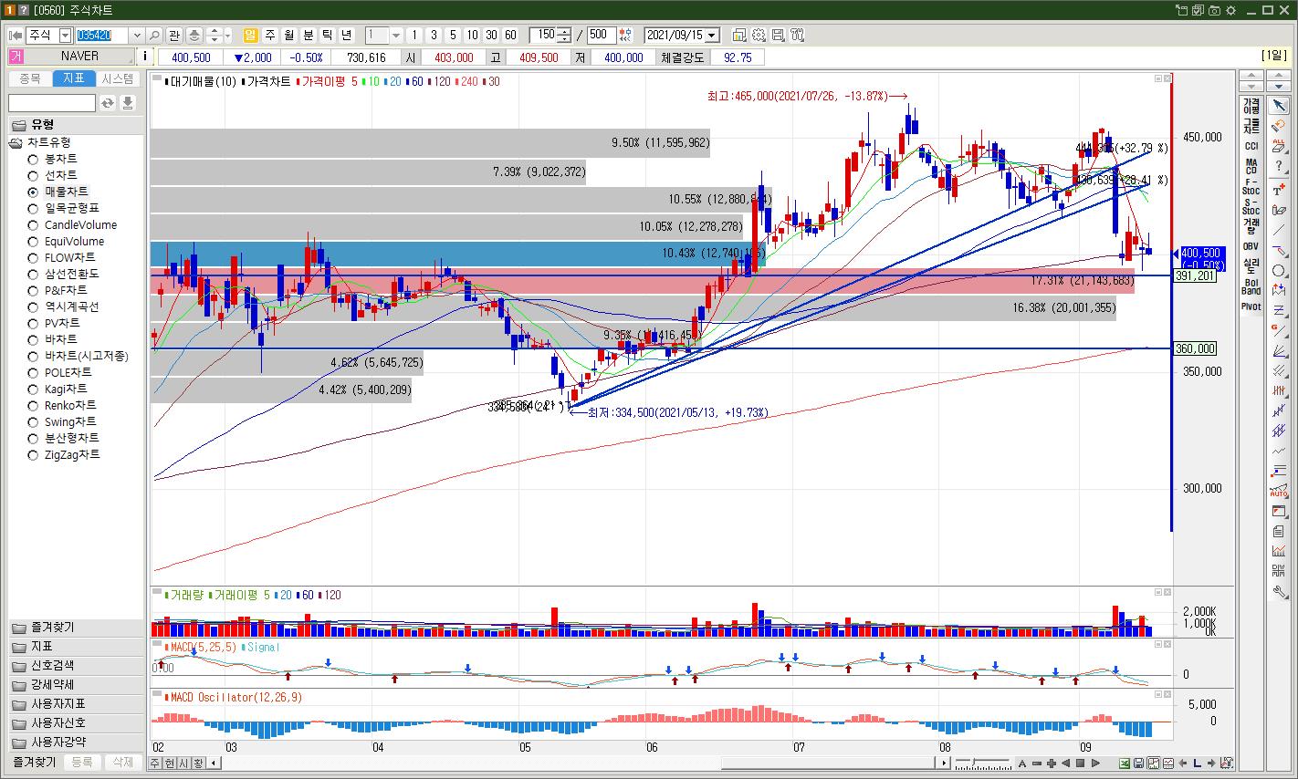일봉차트상 지지라인은 강해보이지만 주봉차트상으로 보기에는 현재가 아래로 39만원 부근이 중장기 추세선입니다. 이를 종가기준으로 이탈한다면 실망 매물이 나오게되고, 단기 매물대 지지라인이 빠르게 무너질 우려가 있습니다.