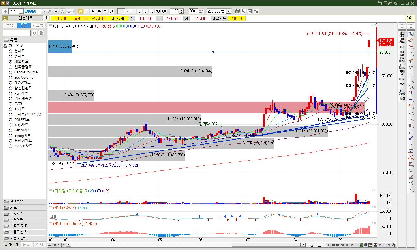 현재 엘앤에프 일봉차트상으로는 175,000원 부근 아래로 주가가 내려올 경우 재차 15만원대까지 강하게 하락할 우려가 있기 때문에, 이 부근 이탈 유무를 체크하는 것이 도움이 될 수 있습니다.