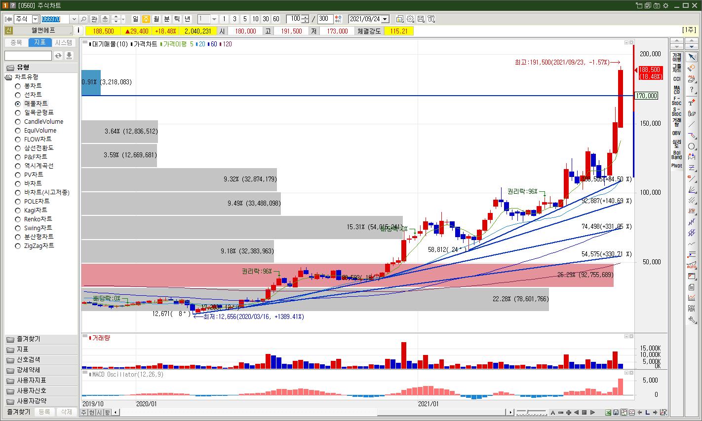 엘앤에프 주식 주봉차트상 3주연속 장대양봉을 뽑아내면서 주가 상승 추세가 강하게 나오고 있습니다. 지난해 3월부터 추세선을 따라 움직이면서 추세선의 기울기를 계속해서 높여가는 전형적인 우상향 추세가 이어지고 있습니다.