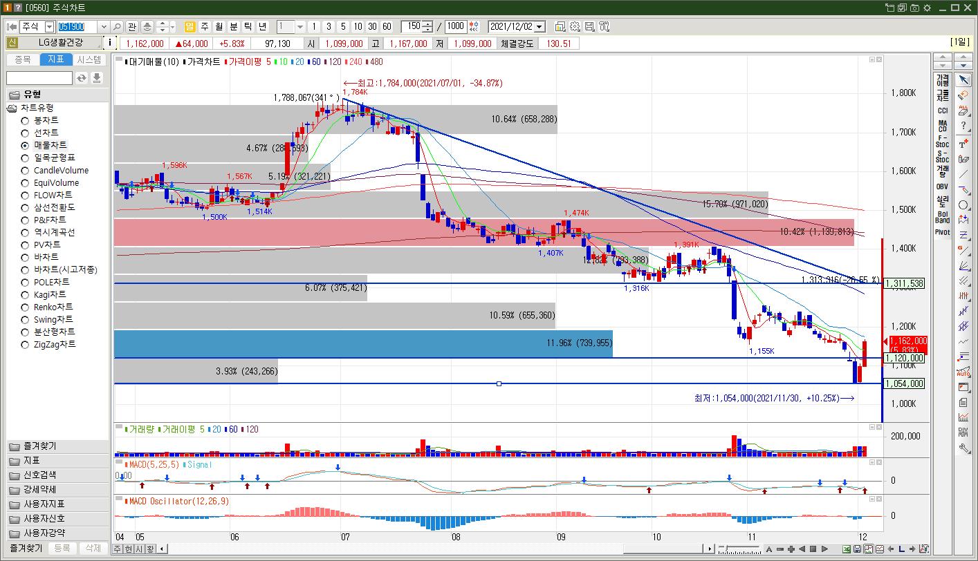 위의 차트는 LG생활건강 주가 일봉차트입니다. 150일간의 차트를 보면 지난 7월초 단기 고점 형성 이후 저점을 낮추어가며 주가가 하락했고, 이후 하락추세가 지속되고 있습니다.
