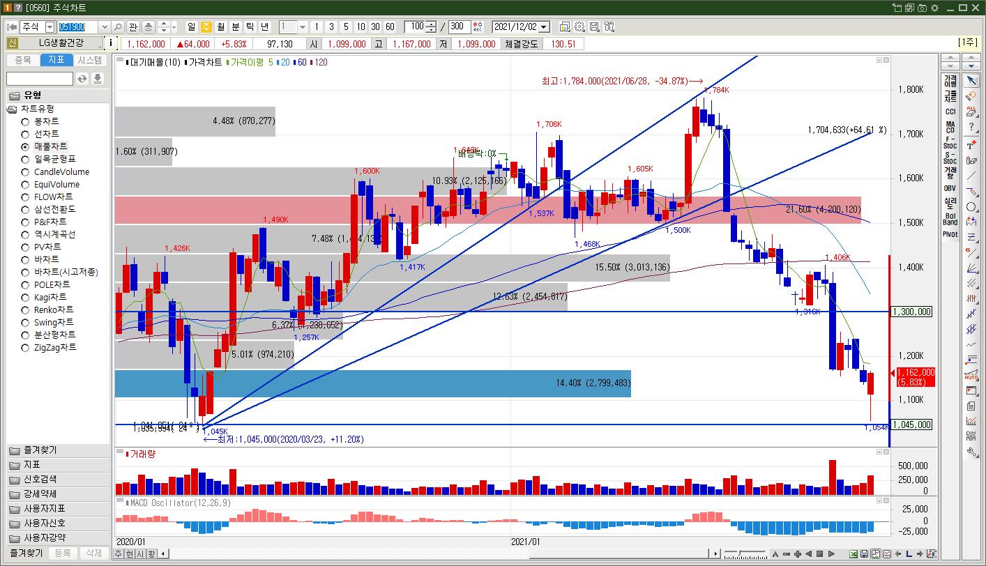 LG생활건강 주식 주봉차트상 지난해 저점 이후 추세선을 따라 주가가 우상향하다가 올해 2월 이 추세선을 이탈한 이후 주춤했고, 이후 반등하다가 7월 추세선을 이탈한 이후 최근까지 중장기 하락추세가 이어져오고 있습니다.
