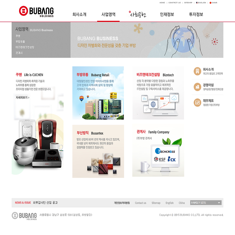 부방은 1979년 12월 설립되어 생활가전 제조 및 판매 그리고 종합 도소매업과 전자부품 제조, 판매를 하는 것을 주 사업으로 하는 기업이었습니다. 부방의 예전 이름은 리홈쿠첸이었습니다. 기업 분할 및 합병 등으로 인해 지금 소개해드리는 부방은 지주사로 전환하고 리빙사업부를 분할하여 쿠첸으로 재상장해 자회사로 두고 있습니다.