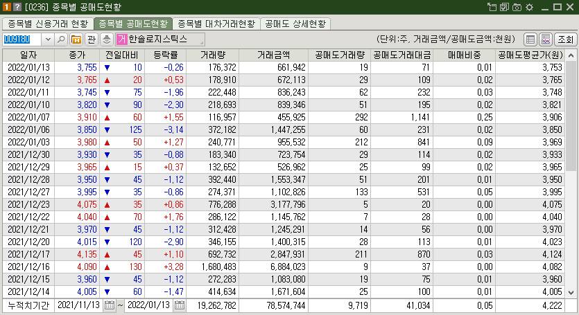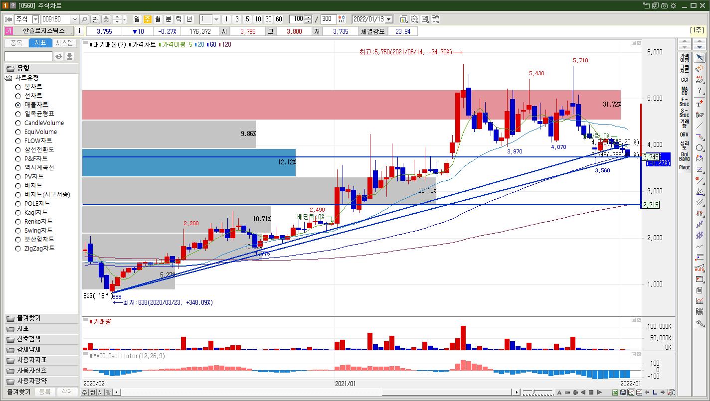 위의 차트는 한솔로지스틱스 주가 일봉차트입니다. 저점이 낮아지면서 하락하는 전형적인 하락 패턴을 보여주고 있는 가운데, 최근 이동평균선 역배열의 단기 하락 파동을 보이고 있습니다.