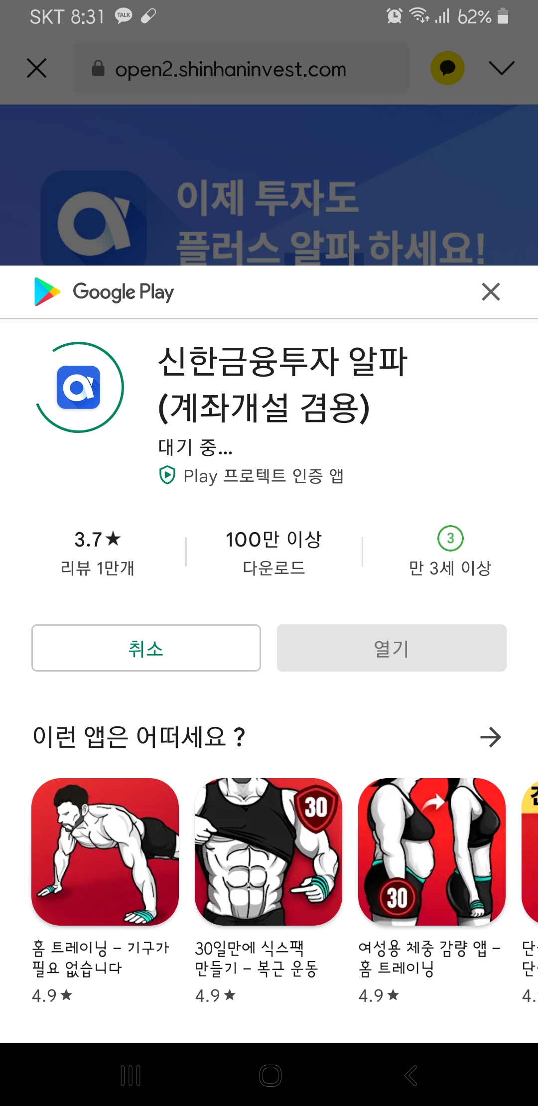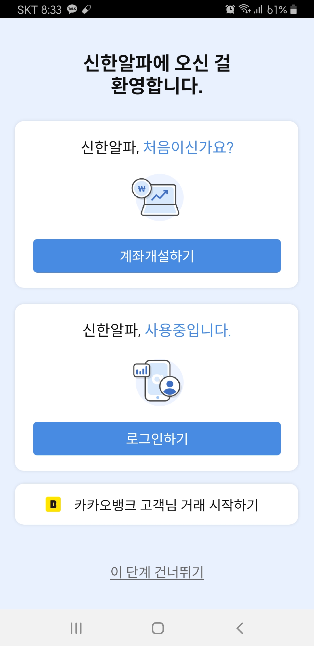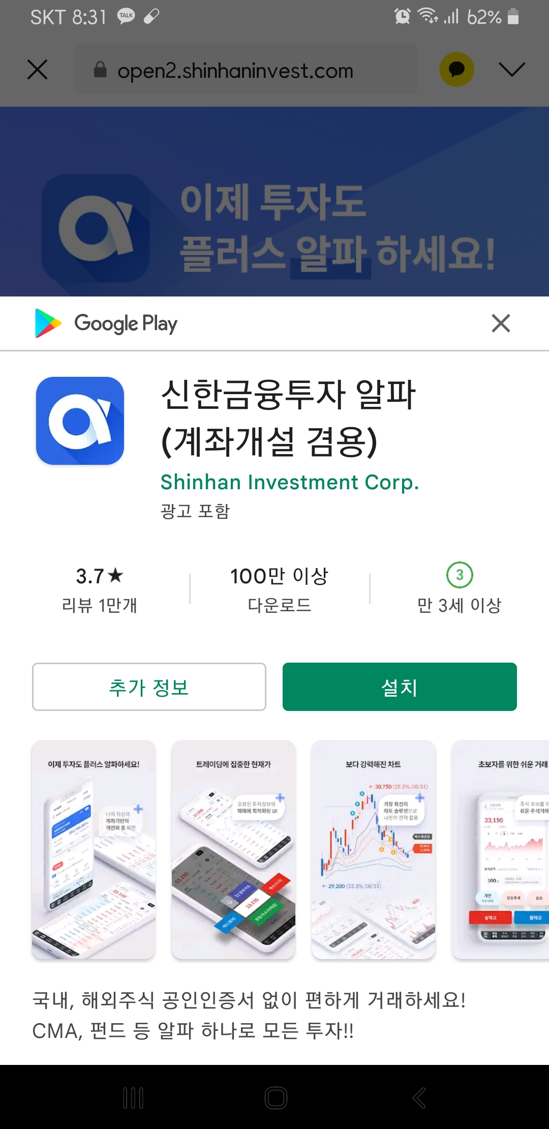 위의 알림톡에서 '앱 설치하고 거래 시작하기' 링크를 타고 들어가면 위와 같은 화면이 나오고, '신한금융투자 알파'(계좌개설 겸용)을 다운로드 받아 신한금융투자로 주식투자를 시작할 수 있습니다.