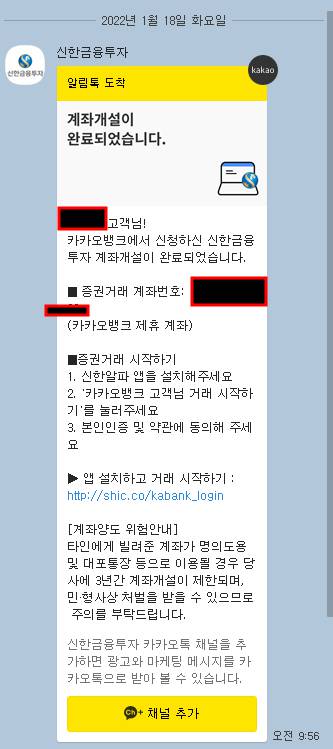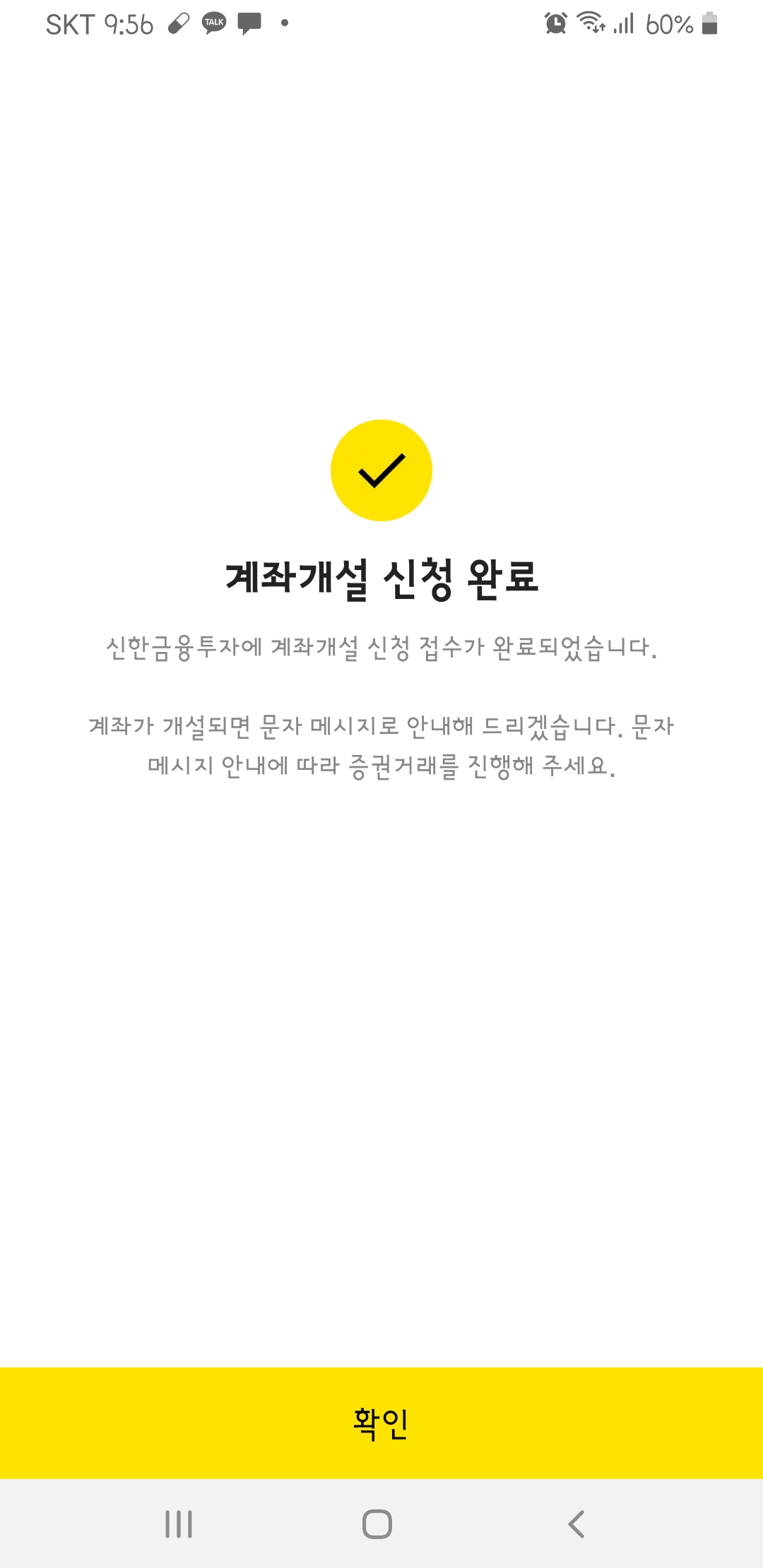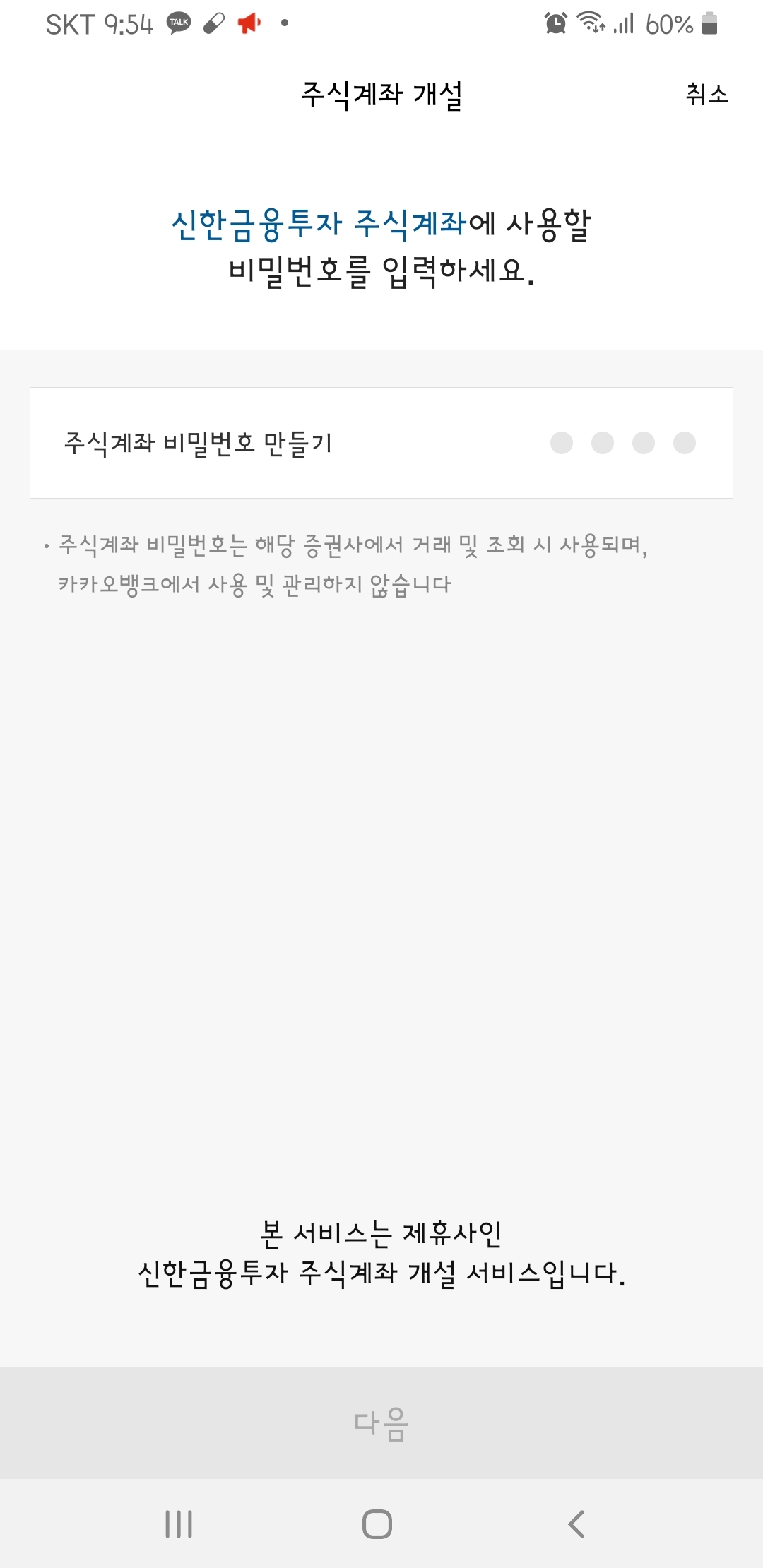 신한금융투자 주식계좌에 사용할 비밀번호 숫자 네자리를 두 번 입력 하면 신한금융투자 비대면 계좌개설 신청이 완료되고, 알림톡으로 증권거래 계좌번호 등과 함께 계좌개설 축하금 5,000원이 카카오뱅크 계좌로 입금됩니다.