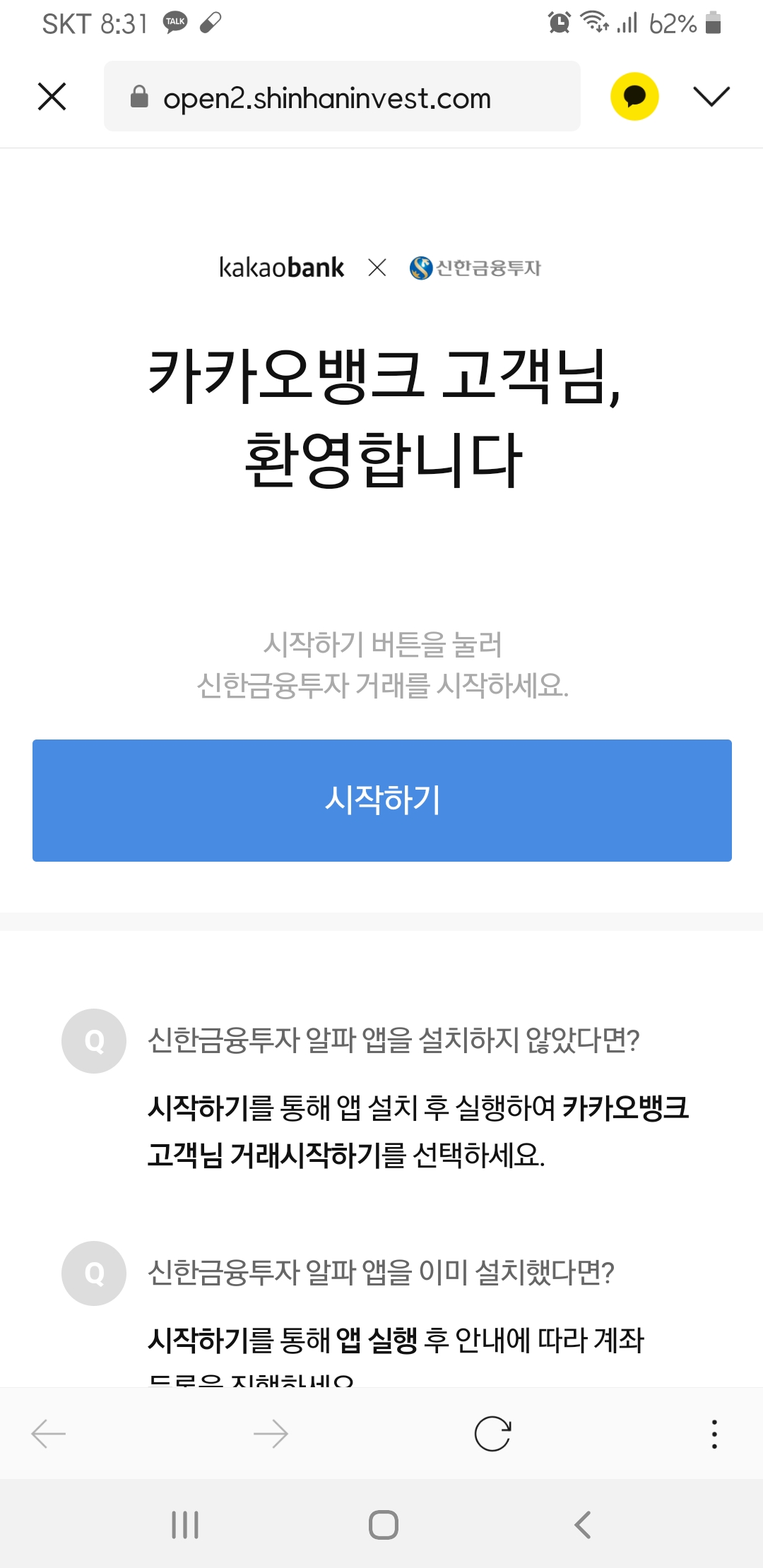 이후 나오는 화면에서 신한알파 계좌개설을 할 수 있는데, 우리는 카카오뱅크로 연계하여 신한금융투자 비대면 계좌개설을 했기 때문에, 하단의 '카카오뱅크 고객님 거래 시작하기'를 선택합니다.