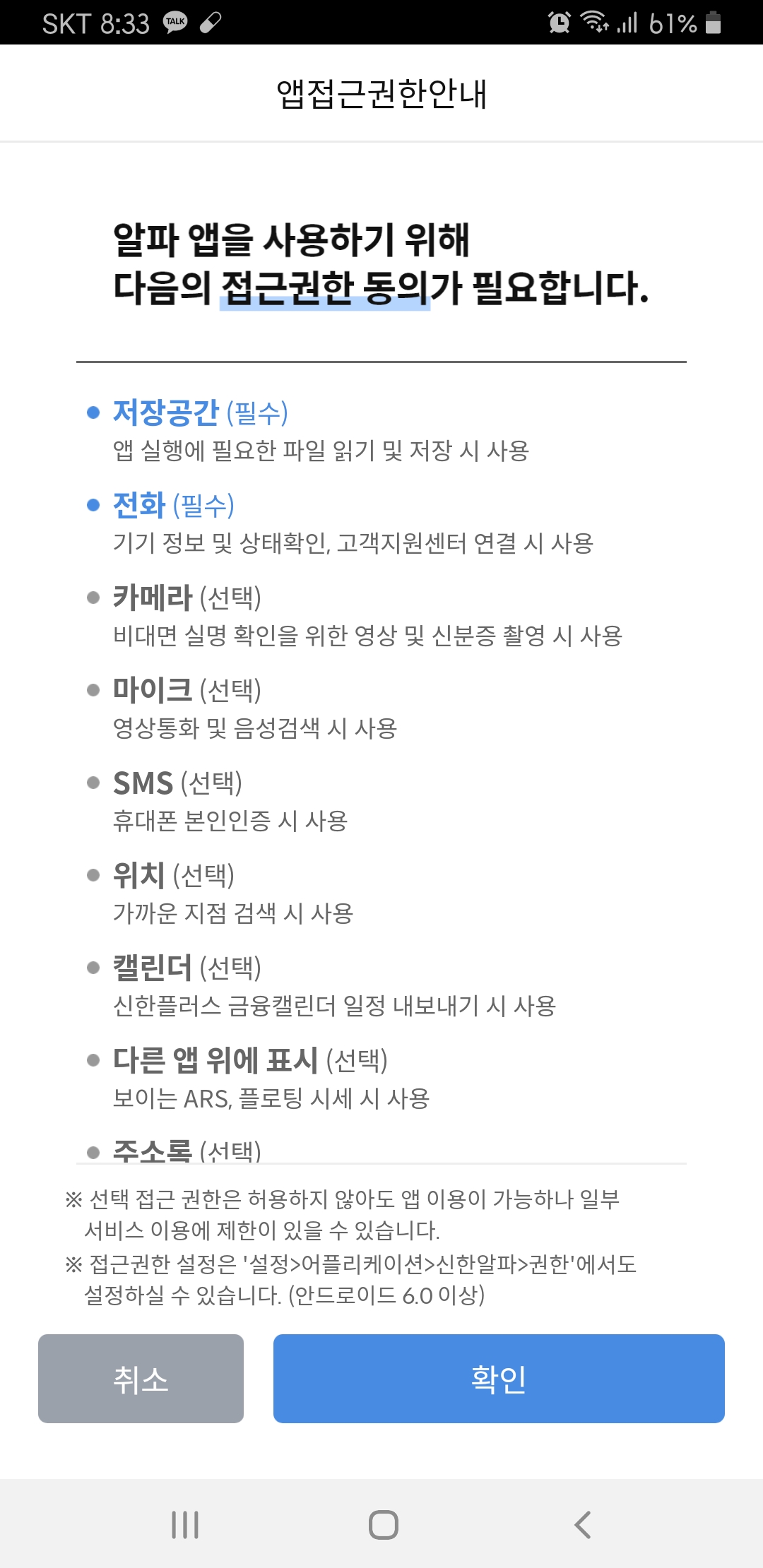애플리케이션을 다운로드 받고 실행하면 앱접근권한 안내 등을 허용 해줍니다.