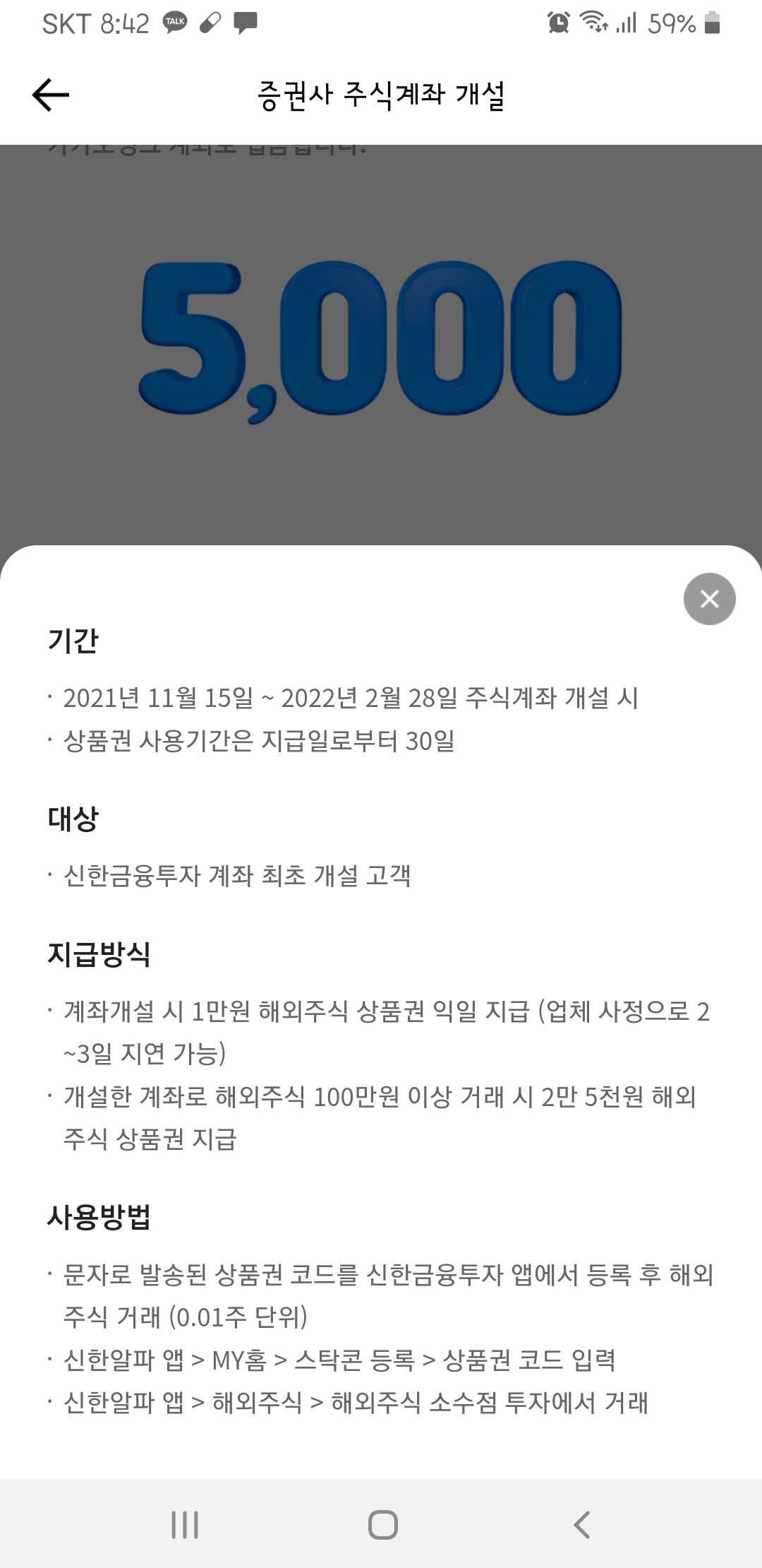 신한금융투자증권 비대면 계좌개설 이벤트 혜택을 조금 더 들여다보면 개설 축하금 5,000원은 가입 즉시 지급하고, 35,000원의 해외주식 상품권은 유의할 점이 있습니다.