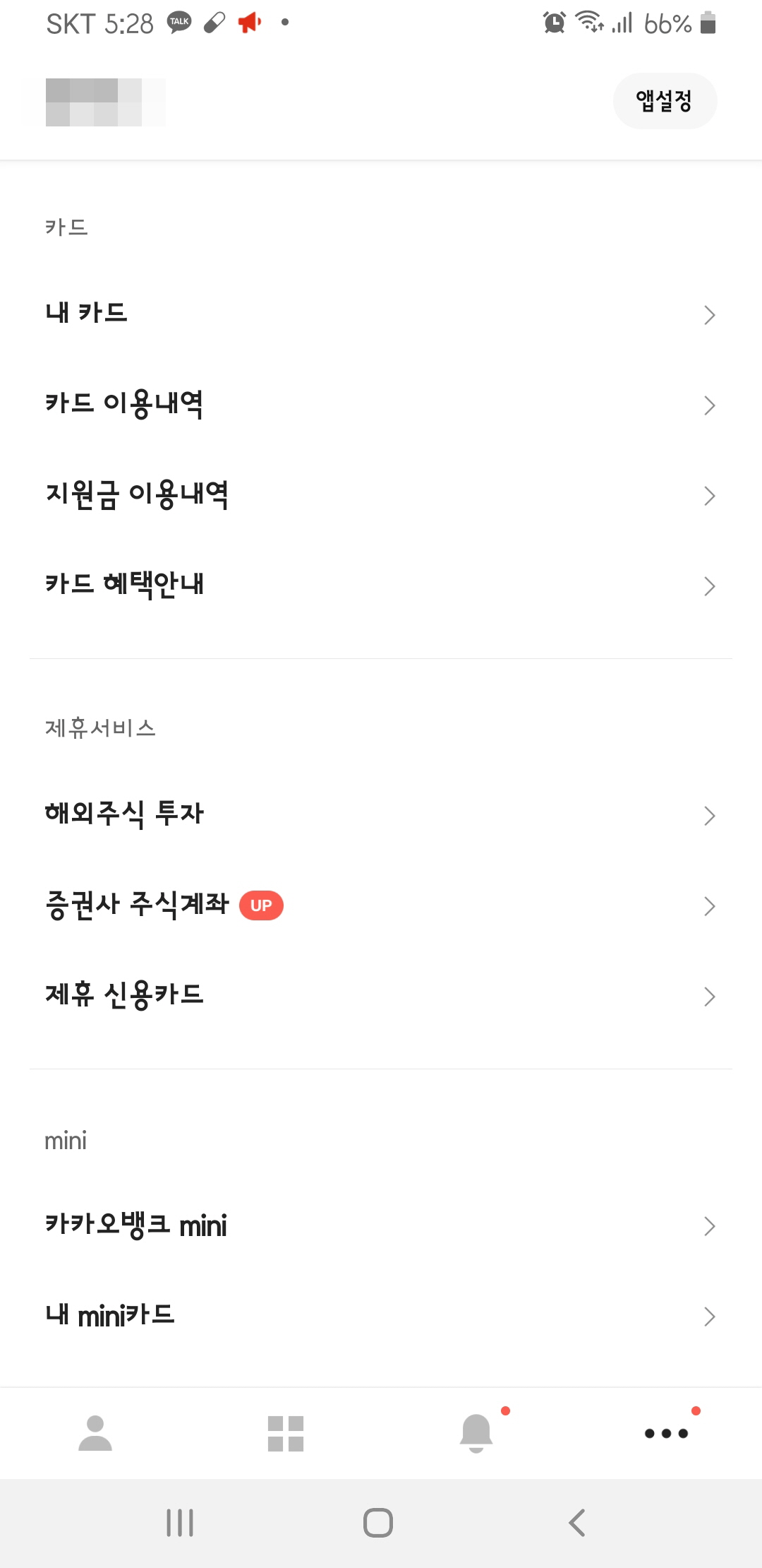카카오뱅크에 접속해 우측 하단의 점 세개(더보기)를 선택하고, 스크롤을 내려보면 '증권사 주식계좌'란이 있습니다.