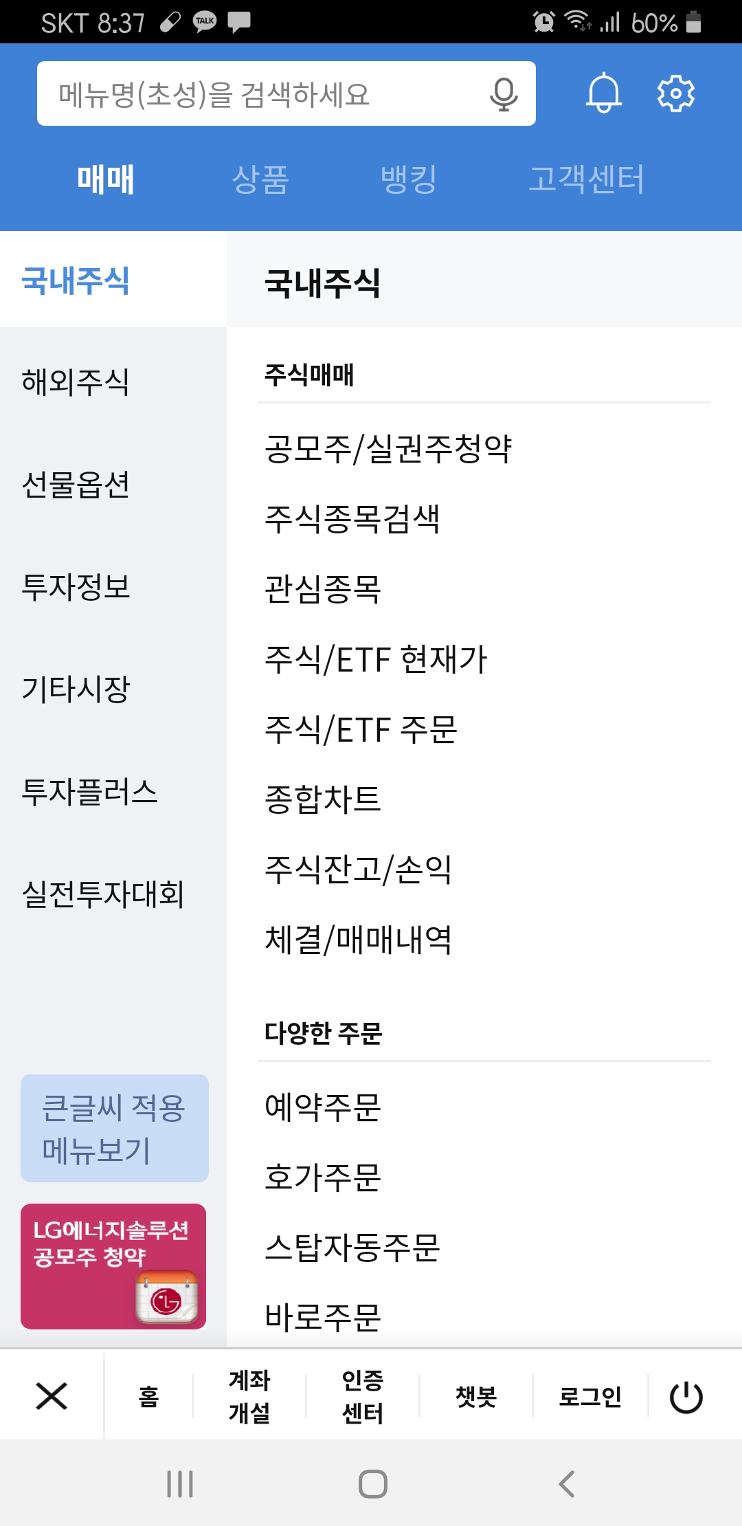 간편인증 등록으로 비밀번호와 지문인증, 패턴인증 등을 등록해 놓으면 신한 알파 로그인을 쉽게 할 수 있고, '국내주식' - '주식매매' - '공모주/실권주 청약' 메뉴에서 LG에너지솔루션 공모주 청약을 진행할 수 있습니다.