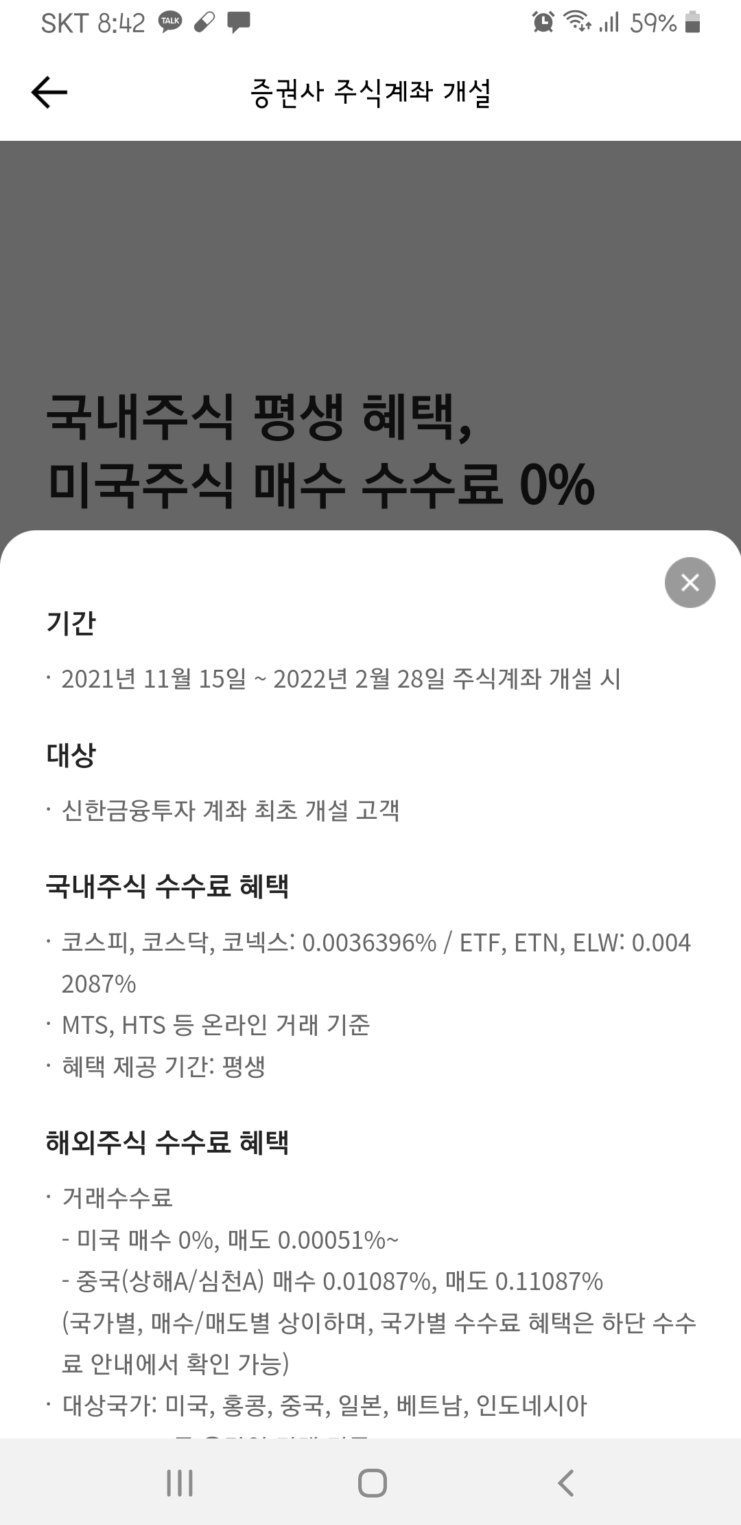 마지막 신한금융투자증권 주식수수료 혜택으로는 코스피와 코스닥, 코넥스 모두 0.0036396%의 수수료 혜택을 받으며, 혜택 제공 기간은 평생입니다.