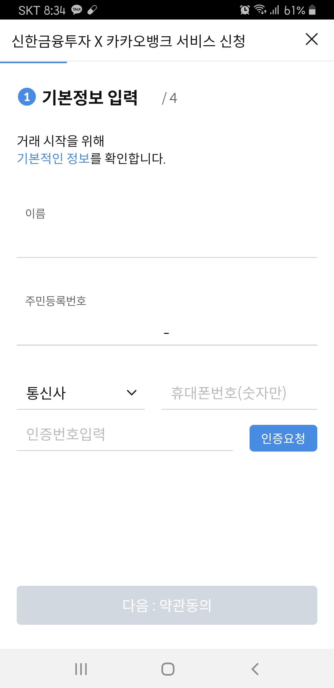 이후 기본정보인 이름과 주민등록번호, 휴대폰 인증 및 약관 확인, 동의 절차를 거칩니다.