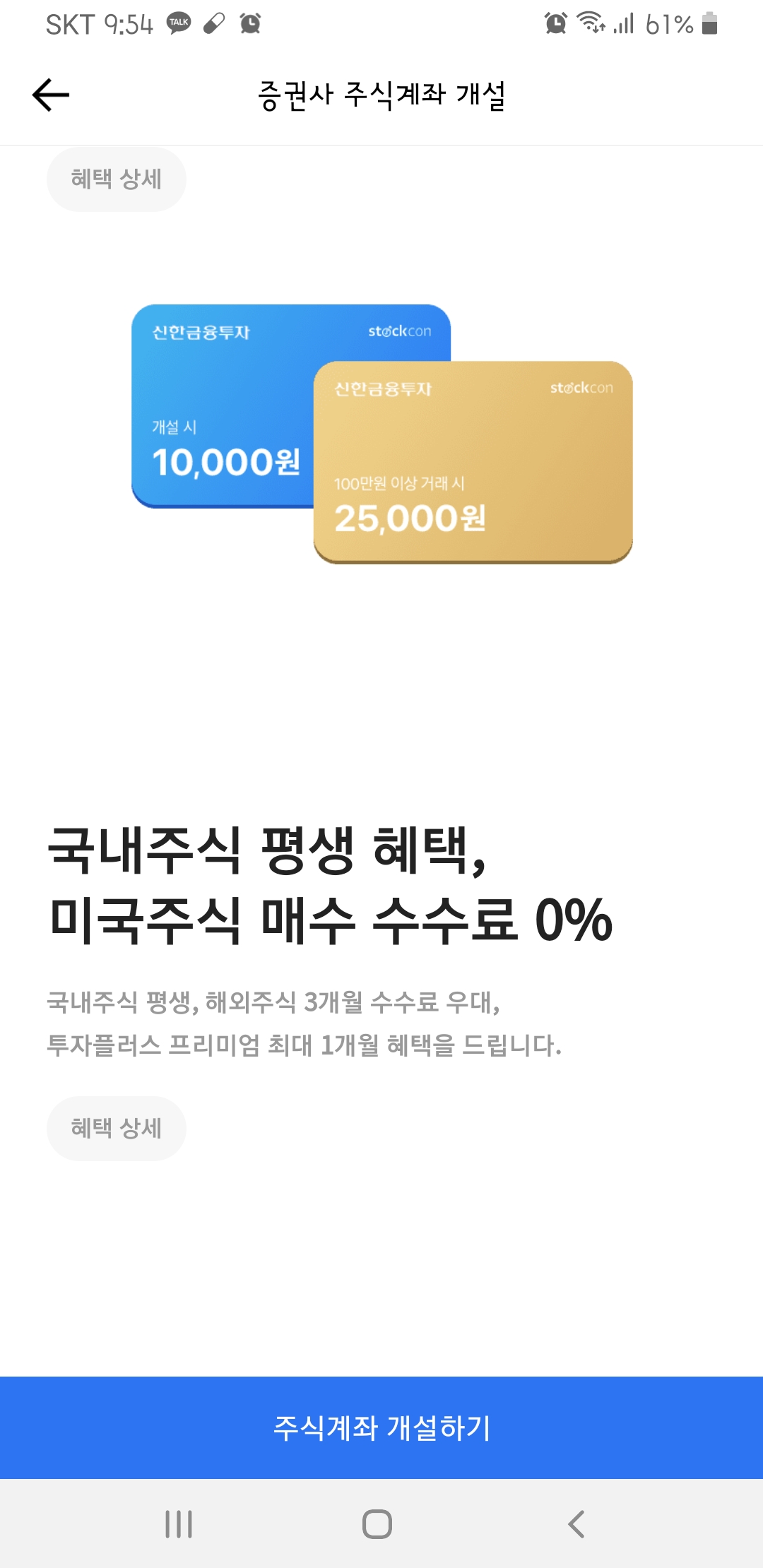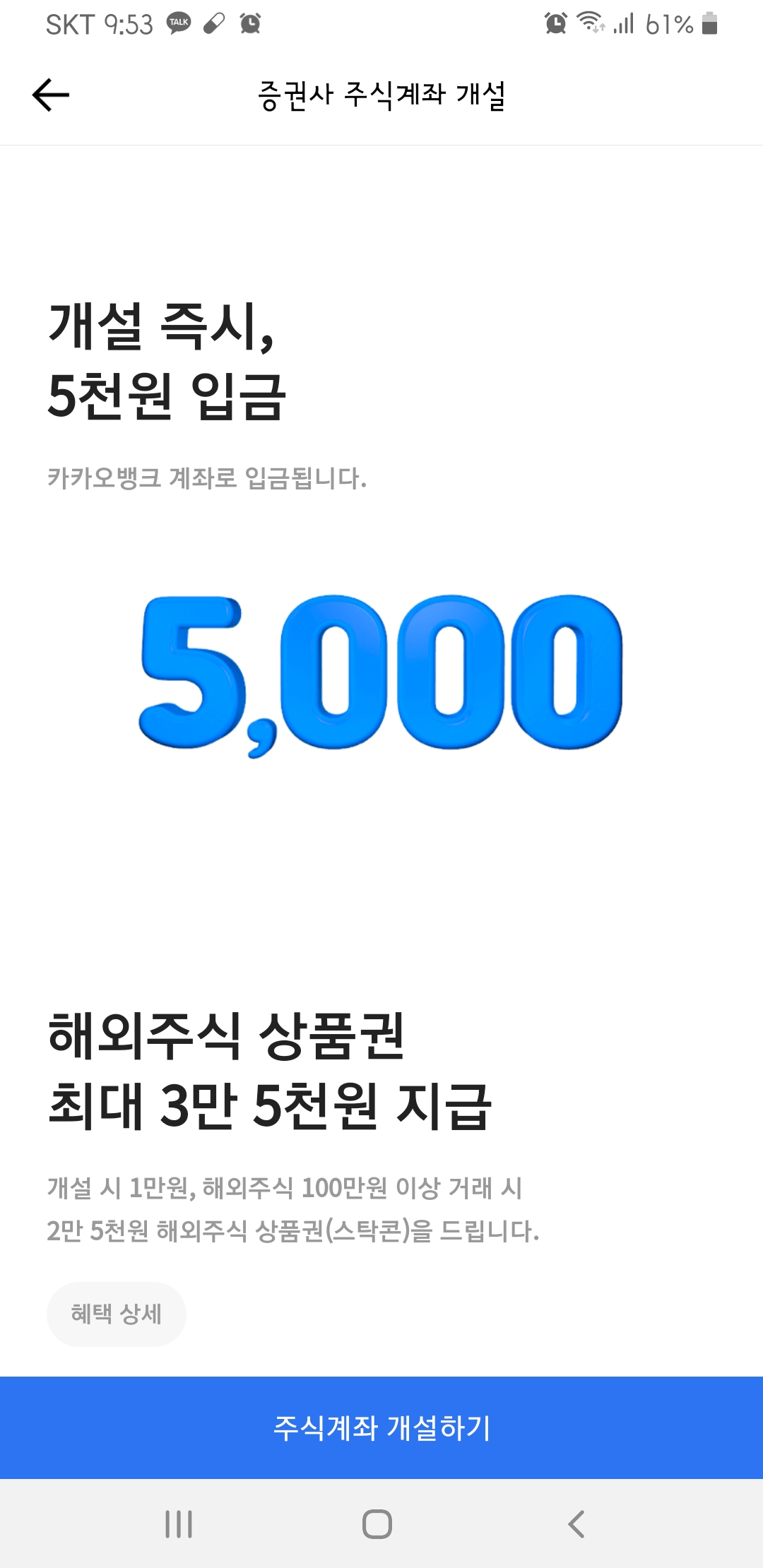 신한금융투자증권 비대면 계좌개설을 카카오뱅크를 연계하여 개설하면 개설 축하금 5,000원과 해외주식 상품권 35,000원, 국내주식 평생 수수료 혜택과 미국 주식 매수 수수료 0% 혜택을 받을 수 있습니다.