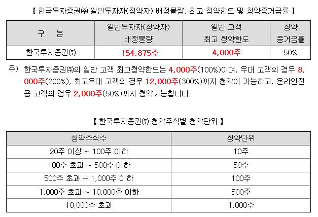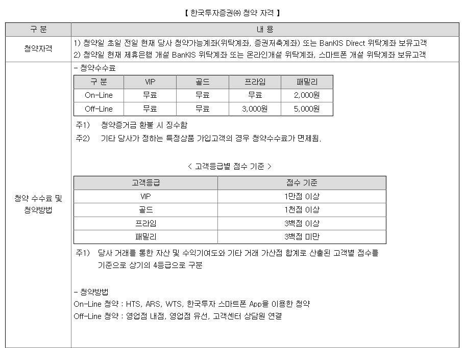 HTS, ARS, WTS, 한국투자 스마트폰 App을 이용한 온라인 청약과 영업점 내점, 영업점 유선, 고객센터 상담원 연결 등의 오프라인 청약을 진행하며, 청약 수수료는 위와 같습니다.