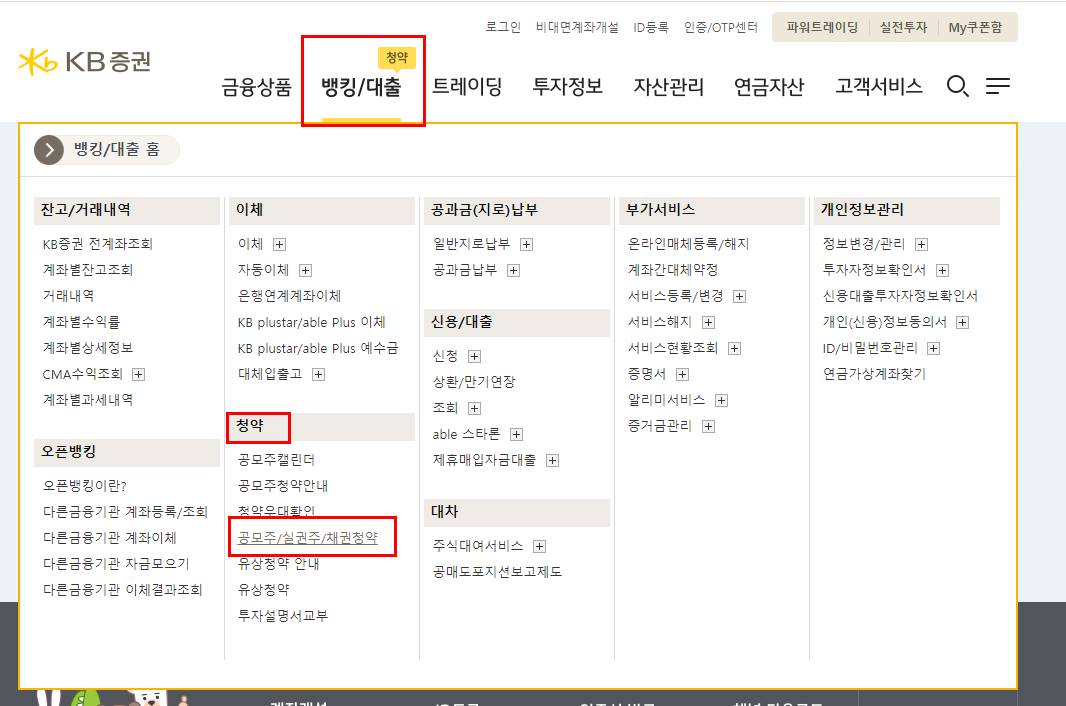 KB증권 홈페이지를 통해 지투파워 공모주를 청약하는 방법은 KB증권 홈페이지 접속 후 상단의 '뱅킹/대출' - '청약' - '공모주/실권주/채권청약' 메뉴를 통해 신청할 수 있습니다.