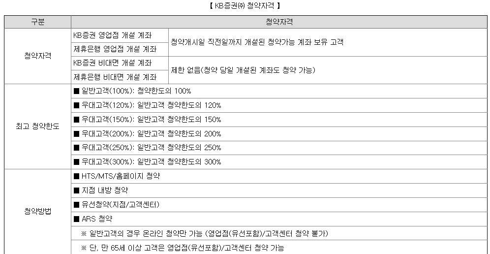 청약일 초일 전일 현재 당사 청약가능계좌(위탁계좌, 증권저축계좌) 또는 BanKIS Direct 위탁계좌 보유고객이거나 청약일 현재 제휴은행 개설 BanKIS 위탁계좌 또는 온라인개설 위탁계좌, 스마트폰 개설 위탁계좌 보유고객을 대상으로 진행합니다.