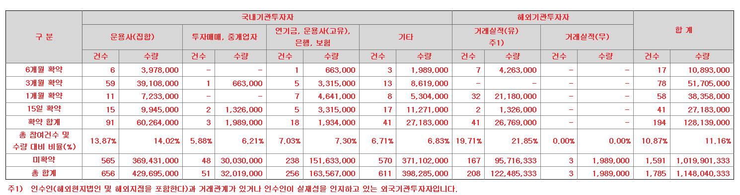 지투파워 수요예측 기관투자자 의무보유 확약 기관 수 및 신청 수량을 체크해보면 총 참여건수 및 수량 대비 비율 11.16% 정도가 상장 후 기관투자자 의무보유 확약을 신청했습니다.