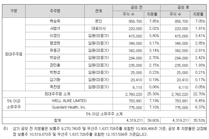 이 외에도 WELL ALIKE LIMITED와 Guardant Health, Inc.가 각각 6.45%(783,991주), 6.37%(775,000주)를 보유하고 있습니다.