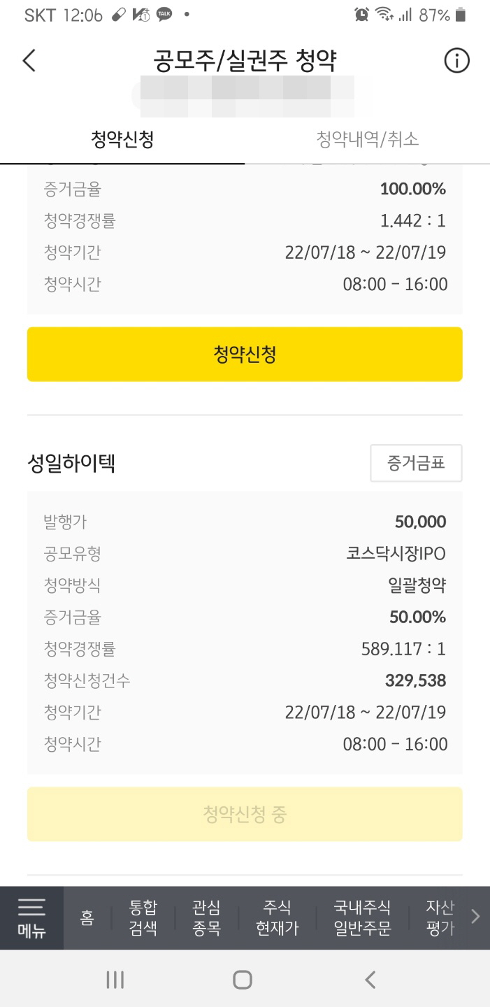 이후 청약을 신청할 계좌를 선택하면 아래 화면을 볼 수 있습니다.