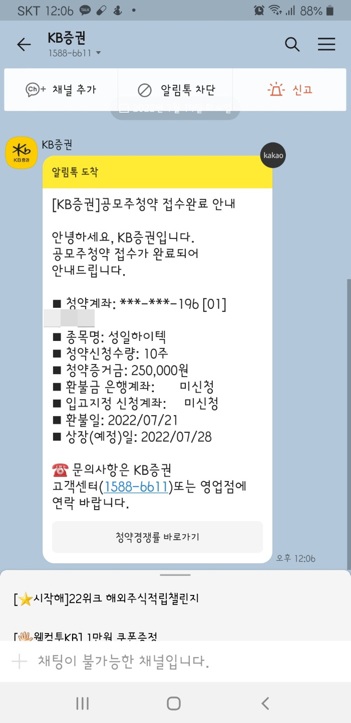 본인이 청약한 내용을 확인하고 완료를 누르면 끝입니다. KB증권 공모주 청약 방법을 올바르게 따라했다면 위처럼 KB증권이 카카오톡으로 청약 관련 내용을 안내해줍니다.