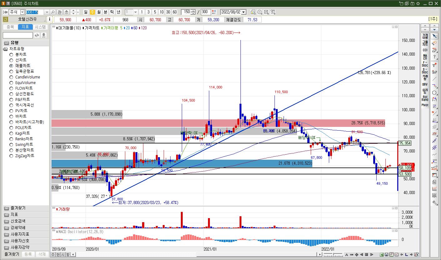 하지만 64,000원 부근까지의 중장기 매물대 저항을 빠르게 소화시킨다면 오히려 중장기 목표주가는 7만 원대 중후반으로 설정해 볼 수 있을 만큼 최근 하락이 과도했기 때문에, 상승 시 매물대 소화 과정 체크 후 목표 주가 대응하는 것이 좋습니다.