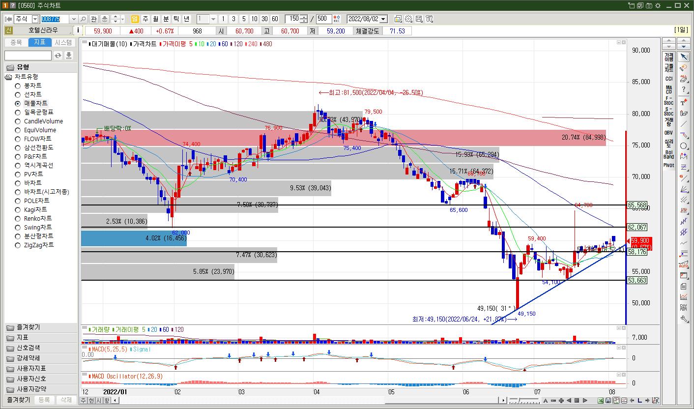 반대로 호텔신라우 주가가 이를 이탈하지 않는다면 반등에 대한 기대감이 있는데, 현재가 위로 단기 저항이 강하지는 않기 때문에 6만원 중반대까지는 단기 목표주가를 설정해도 좋습니다.