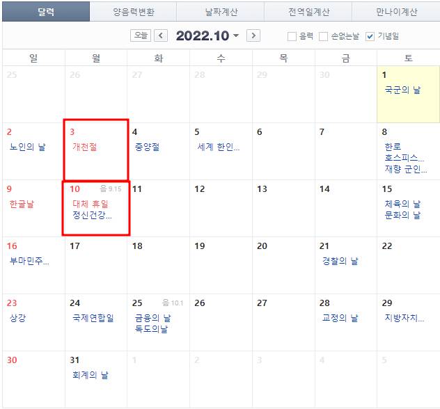 2022년 10월 증시 휴장일은 10월 3일 월요일 개천절과 10월 10일 한글날 대체휴일로 인한 월요일 이틀입니다.