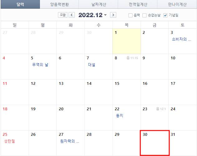 2022년 12월 증시 휴장일은 증시 폐장일인 29일 다음 날인 12월 30일 금요일로, 법정 공휴일은 아니지만 증시 폐장일 이후 하루 쉬기 때문에 이 날은 증시가 개장하지 않습니다.