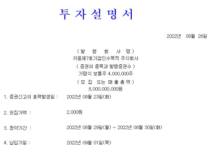키움제7호스팩은 코스닥 시장 상장 후 다른 회사와 인수합병 하는 것을 유일한 사업 목적으로 하는 기업인수목적회사(SPAC) 입니다.
