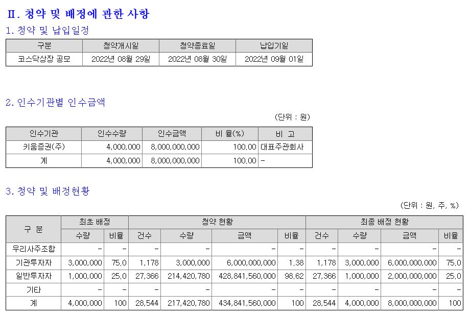 지난 8월 29일부터 30일까지 키움증권을 통해 진행된 키움제7호스팩 공모주 일반 청약에서 214.42대1(비례 429대1)의 공모주 청약 경쟁률을 기록했습니다.
