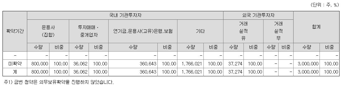 스팩주 특성상 기관투자자들이 손해를 보면서 공모가 이하로 상장일 주식을 던질 일은 거의 없지만, 주가 상승시 이들의 미확약 물량은 주가 상승을 방해하는 요소로 작용할 수 있습니다.
