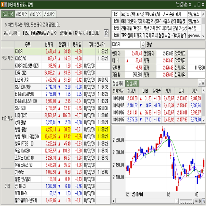 3월 9일 정오 증시체크를 시작하도록 하겠습니다. 전날 뉴욕증시는 도널드 트럼프 대통령의 철강알루미늄 관세폭탄 강행에도 상승했습니다. 캐나다와 멕시코를 관세부과 대상에서 제외하면서 전면적인 무역전쟁에 대한 우려가 완화되었지만 우리나라에 대해서는 언급이 없었습니다.