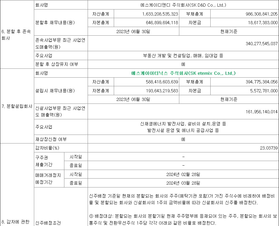 위에서 언급한 SK디앤디의 회사 분할 결정을 조금 더 보면 분할 설립된 SK이터닉스는 신재생에너지 발전사업, 설비의 설치,운영, 발전시설 운영 및 에너지 공급사업 등을 하고, 분할 비율은 분할되는 회사 0.7696261, 신설 회사 0.2303739입니다.