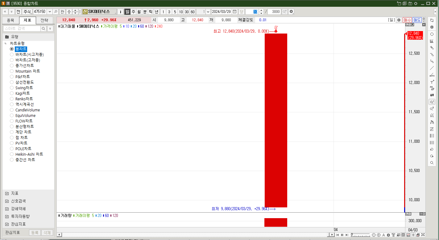 분할 기일은 2024년 3월 1일이고, 분할 상장 첫 날 SK이터닉스는 상한가를 기록하면서 멋지게 등장했습니다.